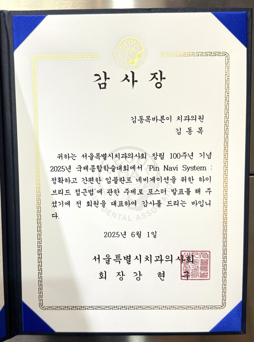 2025년 시덱스 학술대회 포스터 발표 감사장 페이지 정보 작성자 김동목바른이치과 작성일25-06-03 09:50 조회974회 댓글0건 관련링크 이전글 다음글 목록 본문 이번에 특허로 출원한 K-pin navi 에 대한 간략한 내용을 시덱스 학술대회의 포스터로 제출하여 감사장을 받았습니다. K-pin navi 는 김동목바른이치과의 독보적인 기술입니다! 댓글목록 등록된 댓글이 없습니다. 이전글 다음글 목록
