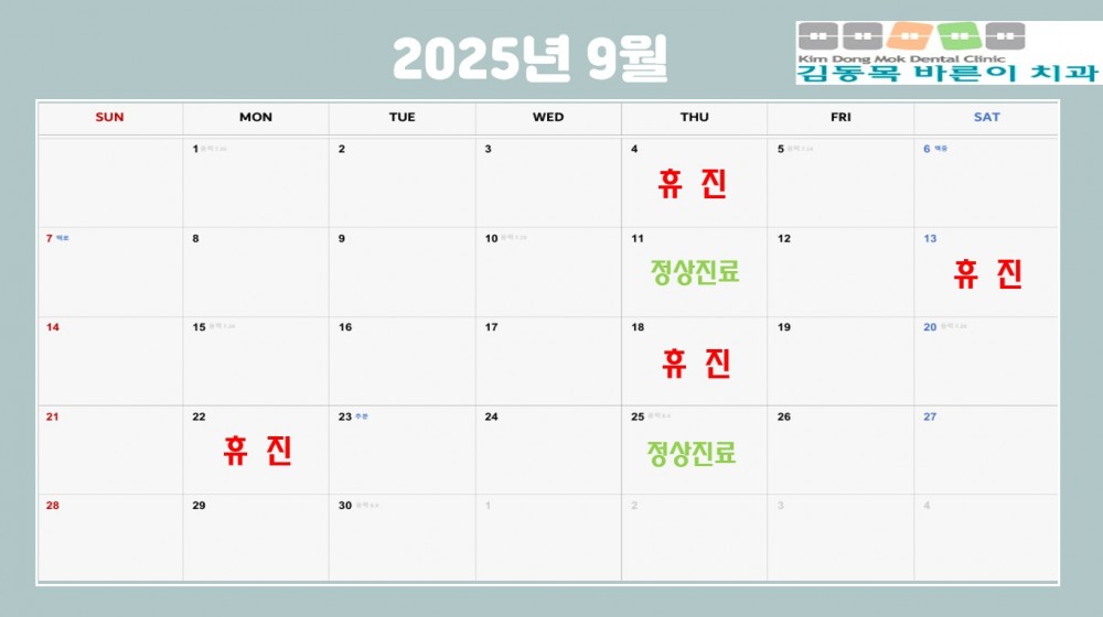 2025년 9월 진료안내입니다. 페이지 정보 작성자 김동목바른이치과 작성일25-08-19 10:59 조회739회 댓글0건 관련링크 이전글 다음글 목록 본문 김동목바른이치과 2025년 9월 진료안내입니다. 댓글목록 등록된 댓글이 없습니다. 이전글 다음글 목록