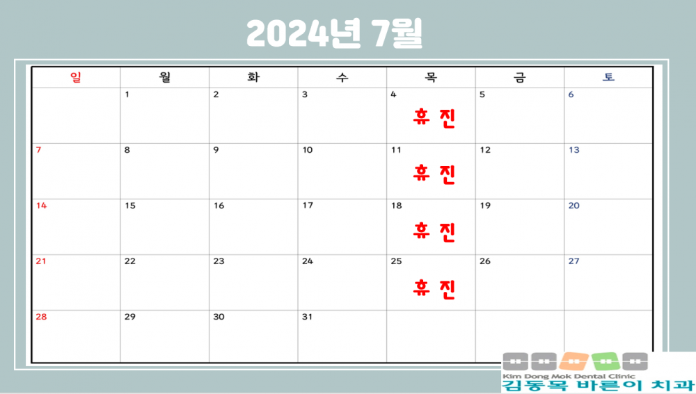 2024년 7월 진료안내입니다. 페이지 정보 작성자 김동목바른이치과 작성일24-06-28 10:40 조회2,022회 댓글0건 관련링크 이전글 다음글 목록 본문 2024년 7월 진료안내입니다. 댓글목록 등록된 댓글이 없습니다. 이전글 다음글 목록