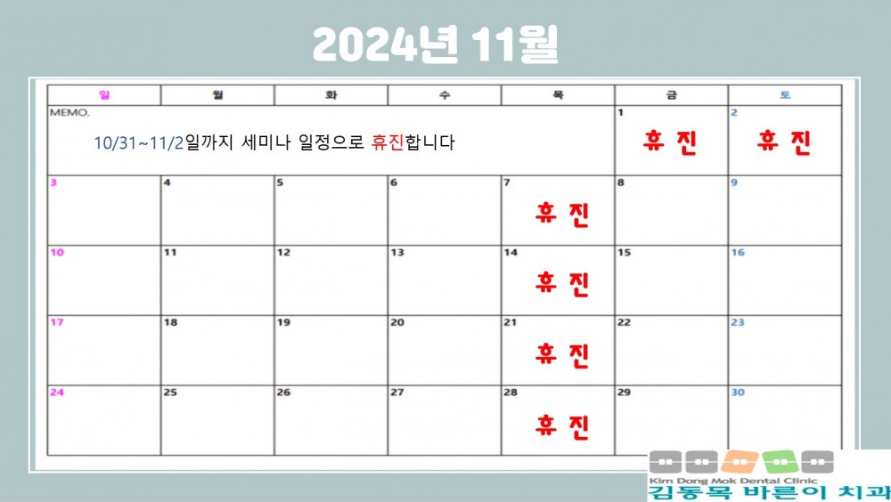 2024년 11월 진료 안내입니다 페이지 정보 작성자 김동목바른이치과 작성일24-10-21 11:08 조회1,579회 댓글0건 관련링크 이전글 다음글 목록 본문 2024년 11월 진료 안내입니다 댓글목록 등록된 댓글이 없습니다. 이전글 다음글 목록