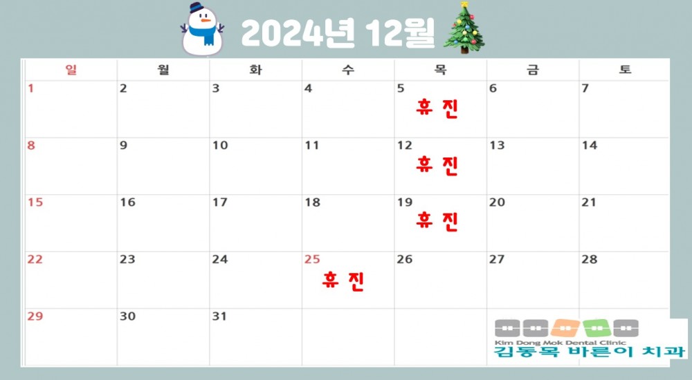2024년 12월 진료 안내입니다 페이지 정보 작성자 김동목바른이치과 작성일24-11-16 11:26 조회1,377회 댓글0건 관련링크 이전글 다음글 목록 본문 2024년 12월 진료 안내입니다 댓글목록 등록된 댓글이 없습니다. 이전글 다음글 목록