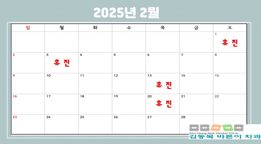 2025년 2월 진료안내입니다 페이지 정보 작성자 김동목바른이치과 작성일25-01-13 15:20 조회1,183회 댓글0건 관련링크 이전글 다음글 목록 본문 2025년 2월 진료안내입니다 문의사항 있으시면 053-562-5600 전화주시면 바로 도와드리겠습니다. 댓글목록 등록된 댓글이 없습니다. 이전글 다음글 목록
