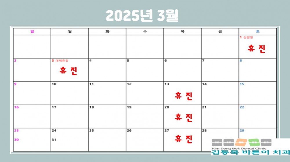 2025년 3월 진료안내입니다 페이지 정보 작성자 김동목바른이치과 작성일25-02-18 10:28 조회1,017회 댓글0건 관련링크 이전글 다음글 목록 본문 2025년 3월 진료안내입니다.문의사항시 053-562-5600 으로 전화주시면 감사하겠습니다 ^^ 댓글목록 등록된 댓글이 없습니다. 이전글 다음글 목록