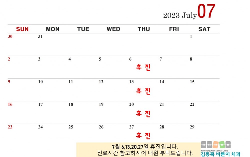 2023년 07월 진료안내 입니다. 페이지 정보 작성자 김동목바른이치과 작성일23-06-27 10:01 조회2,554회 댓글0건 관련링크 이전글 다음글 목록 본문 댓글목록 등록된 댓글이 없습니다. 이전글 다음글 목록