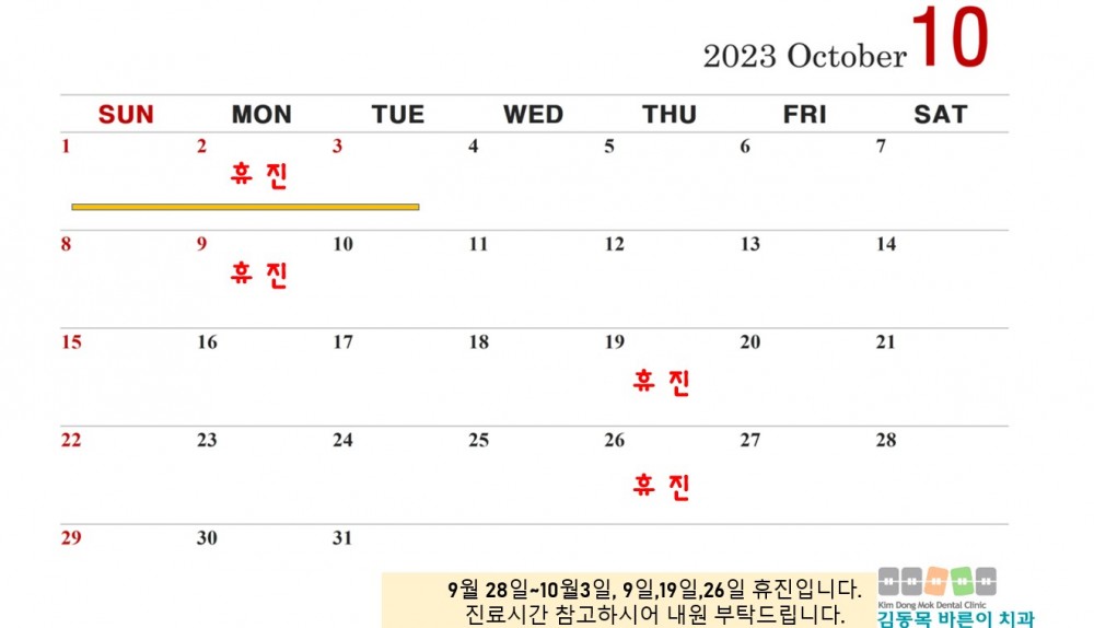2023년 10월 진료안내 입니다. 페이지 정보 작성자 김동목바른이치과 작성일23-09-23 08:50 조회2,218회 댓글0건 관련링크 이전글 다음글 목록 본문 댓글목록 등록된 댓글이 없습니다. 이전글 다음글 목록