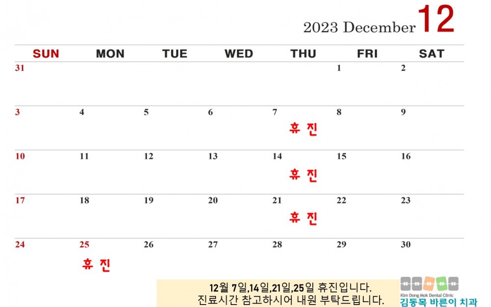 2023년 12월 진료안내 입니다. 페이지 정보 작성자 김동목바른이치과 작성일23-11-28 15:26 조회2,102회 댓글0건 관련링크 이전글 다음글 목록 본문 댓글목록 등록된 댓글이 없습니다. 이전글 다음글 목록