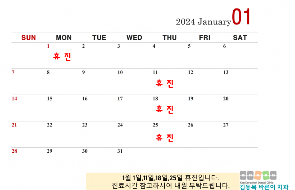 2024년 1월 진료안내 입니다 페이지 정보 작성자 김동목바른이치과 작성일23-12-16 12:59 조회2,189회 댓글0건 관련링크 이전글 다음글 목록 본문 댓글목록 등록된 댓글이 없습니다. 이전글 다음글 목록