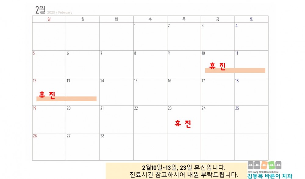 2023년 02월 진료안내 입니다. 페이지 정보 작성자 김동목바른이치과 작성일23-01-30 11:11 조회2,488회 댓글0건 관련링크 이전글 다음글 목록 본문 댓글목록 등록된 댓글이 없습니다. 이전글 다음글 목록