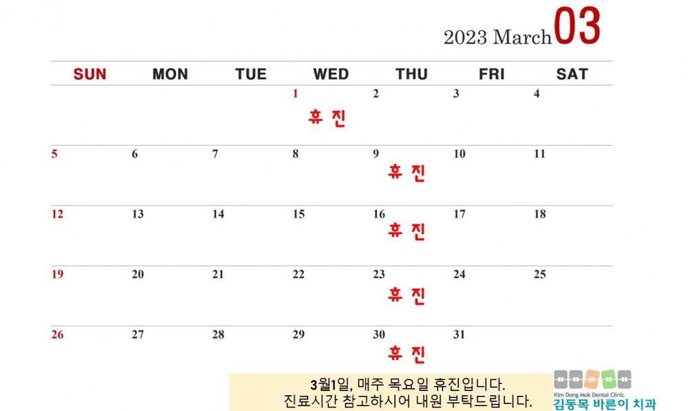 2023년 03월 진료안내 입니다. 페이지 정보 작성자 김동목바른이치과 작성일23-02-28 10:05 조회2,533회 댓글0건 관련링크 이전글 다음글 목록 본문 댓글목록 등록된 댓글이 없습니다. 이전글 다음글 목록