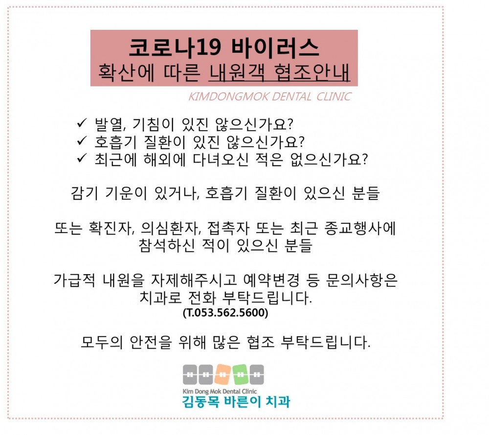 코로나19 확산에 따른 내원객 협조안내. 페이지 정보 작성자 김동목바른이치과 작성일20-02-24 19:32 조회3,732회 댓글0건 관련링크 이전글 다음글 목록 본문 댓글목록 등록된 댓글이 없습니다. 이전글 다음글 목록