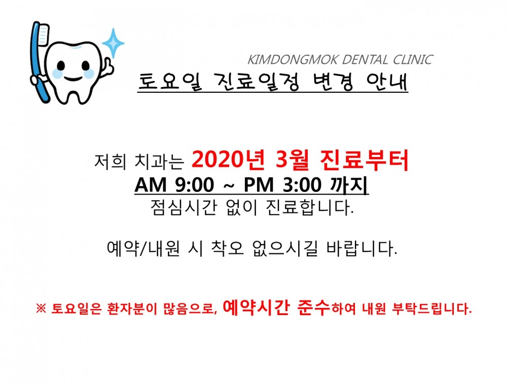 ※2020년 3월 토요일 진료시간 변경안내※ 페이지 정보 작성자 김동목바른이치과 작성일20-02-29 12:29 조회4,064회 댓글0건 관련링크 이전글 다음글 목록 본문 댓글목록 등록된 댓글이 없습니다. 이전글 다음글 목록