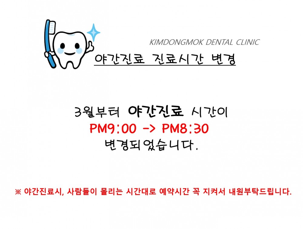 ※2022년 3월부터 야간진료시간이 변경됩니다. 페이지 정보 작성자 김동목바른이치과 작성일22-01-21 12:38 조회3,275회 댓글0건 관련링크 이전글 다음글 목록 본문 댓글목록 등록된 댓글이 없습니다. 이전글 다음글 목록
